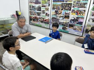 杉野さんは、ヘリテージルームの貴重な写真を使い、優しく、そして熱意をもって当時の様子を語ってくださいました。「校舎がなぜ白色なのか?」という素朴な質問への答えは、「日本らしさを校舎に込めたかった」という、設計に込められた強い想い。子供たちは、普段見上げている校舎に秘められたストーリーに深く聞き入っていました。