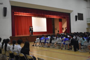 11月28日(金)の6時間目に新生徒会メンバーになって初めての生徒集会が行われ、各専門委員会の新委員長から、委員会のメンバーや今後の方針について説明がありました。