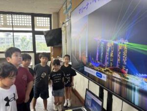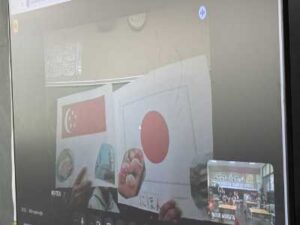 まず、シンガポールと日本の生活や文化について、お互いに紹介し合いました。本校の子供たちは、シンガポールの有名な観光地であるマリーナ・ベイ・サンズや、チリクラブなどの食べ物を画面に映して紹介し、大谷小学校の子供たちは、日本の秋の生き物や食べ物、学校生活について、スライドや実物を用いて紹介してくれました。