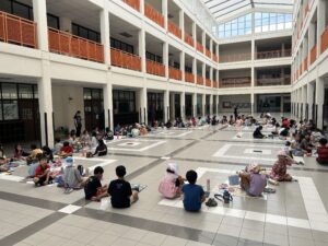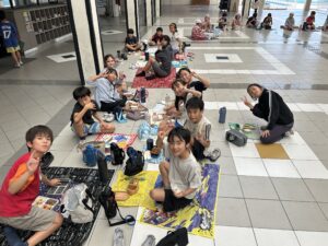 今日は、二学期最後の「3のつく日」で、3学年全員が一同に集まってお弁当を食べる日でした。普段は教室で食べるお弁当ですが、今日はみんなで大きな円になって一緒にいただきました 。