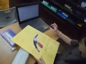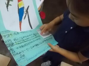 ある子供は、私の前に来て、鳥の鳴き声クイズを出してくれました。紙をめくると答えが分かるように仕掛けられており、伝え方に工夫が見られました。調べたことをただ発表するだけでなく、どのように伝えるか、読み手を意識したアウトプットは、表現力や思考力を高めるよい機会です。