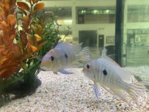 プロの手によって設置された新しい水槽には、さっそく新しい魚たちが仲間入りしました。砂を口に含んで掃除をするというユニークな習性をもつアースイーターなどです。子供たちが登校し、エントランスで目を輝かせて驚く姿が目に浮かびます。