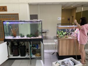始業式で紹介した嬉しいニュースが、早くも形となりました。本校の卒業生であり、現在はシンガポールで魚の飼育に関わる専門的な仕事に携わっている仲谷英美里さんが、放課後に来校されました。今年から「水槽アドバイザー」として、母校のために力を貸してくださることになっています。