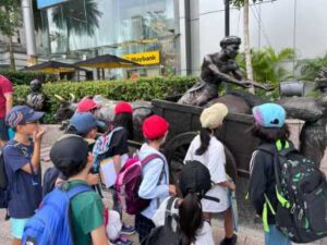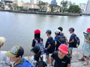 社会科の学習の一環として、シンガポールリバー沿いを巡る校外学習を実施しています。子供たちはこれまで、教室での資料学習を通してシンガポールリバーの歴史について学んできましたが、今日はその「今の姿」を自分たちの目で調査することが目的です。