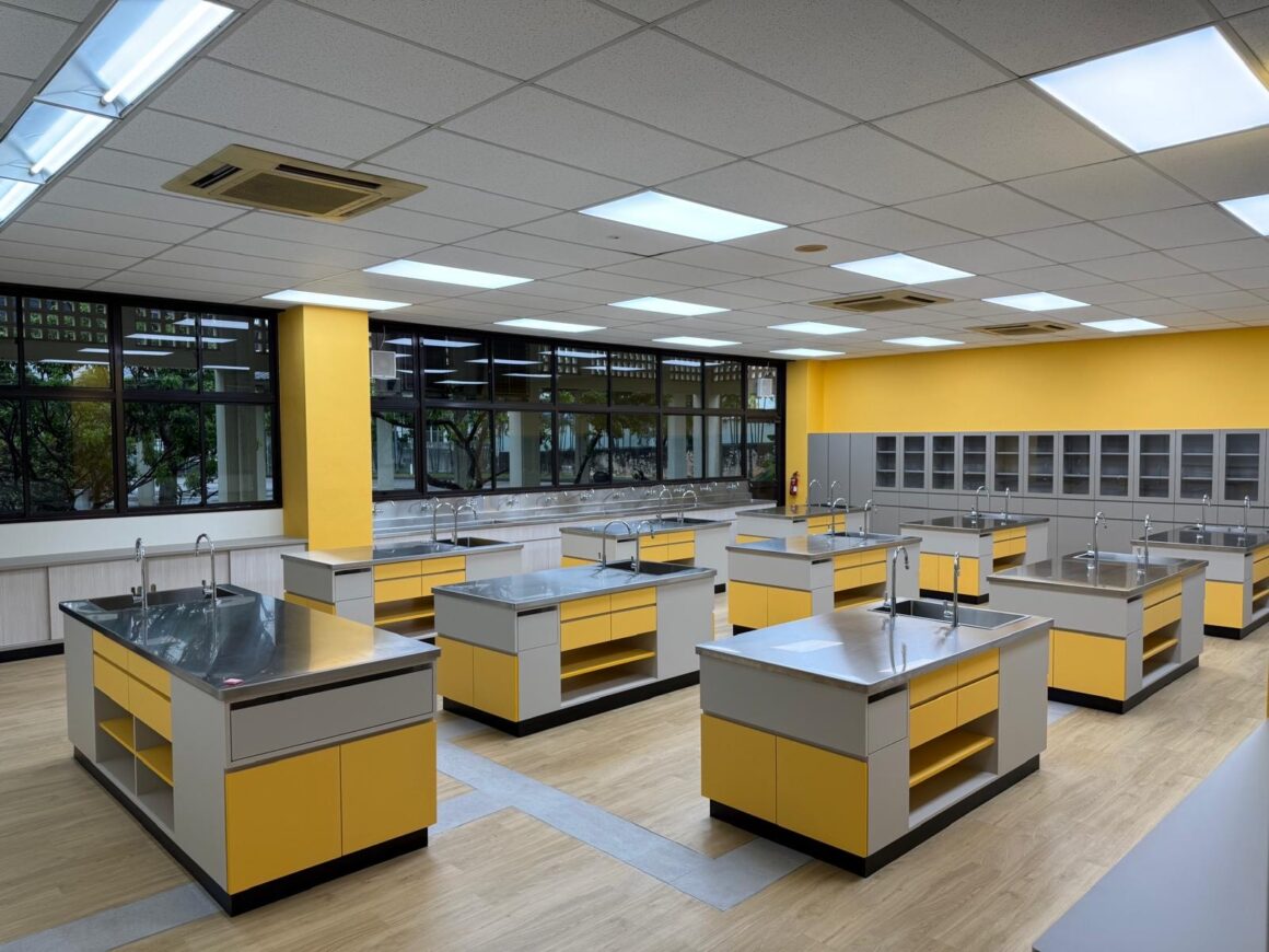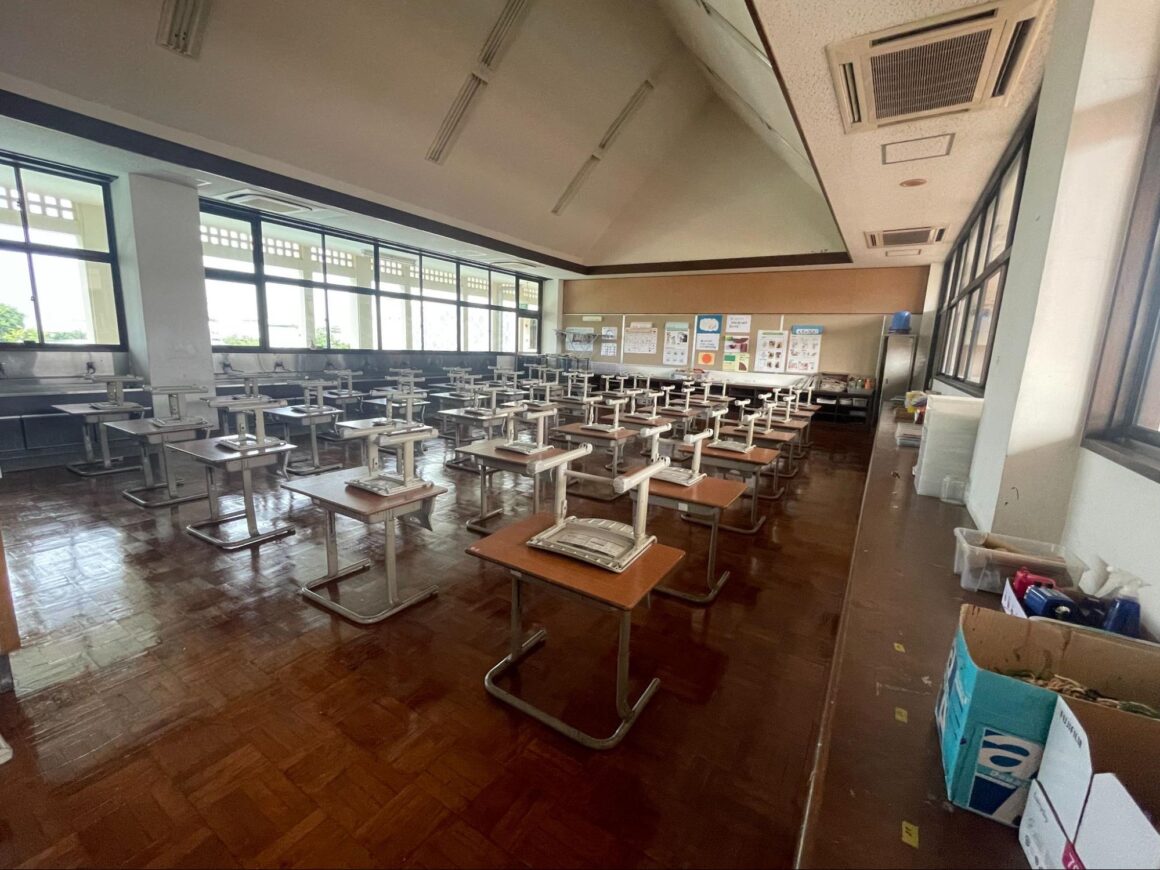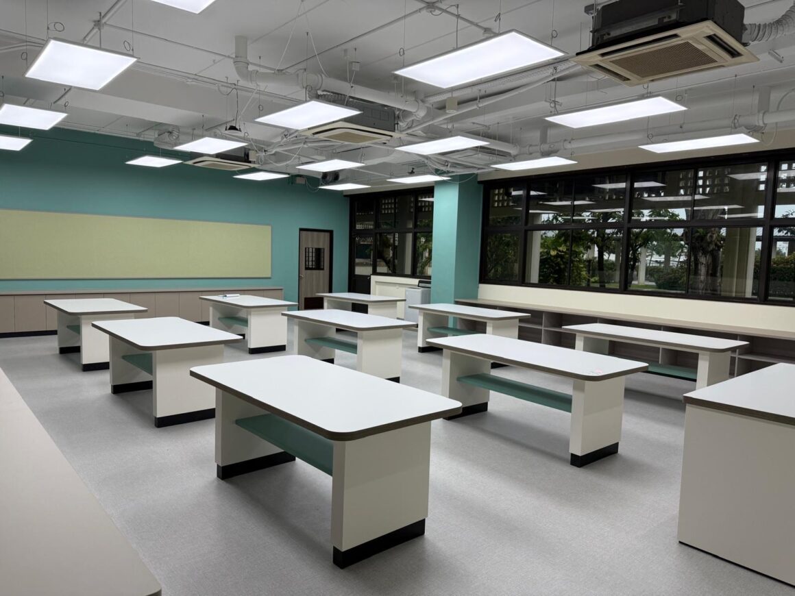 明るく清潔な教室は、学年や教科に合わせた机・椅子・学習ツールが整備され、集中して学習できる空間です。