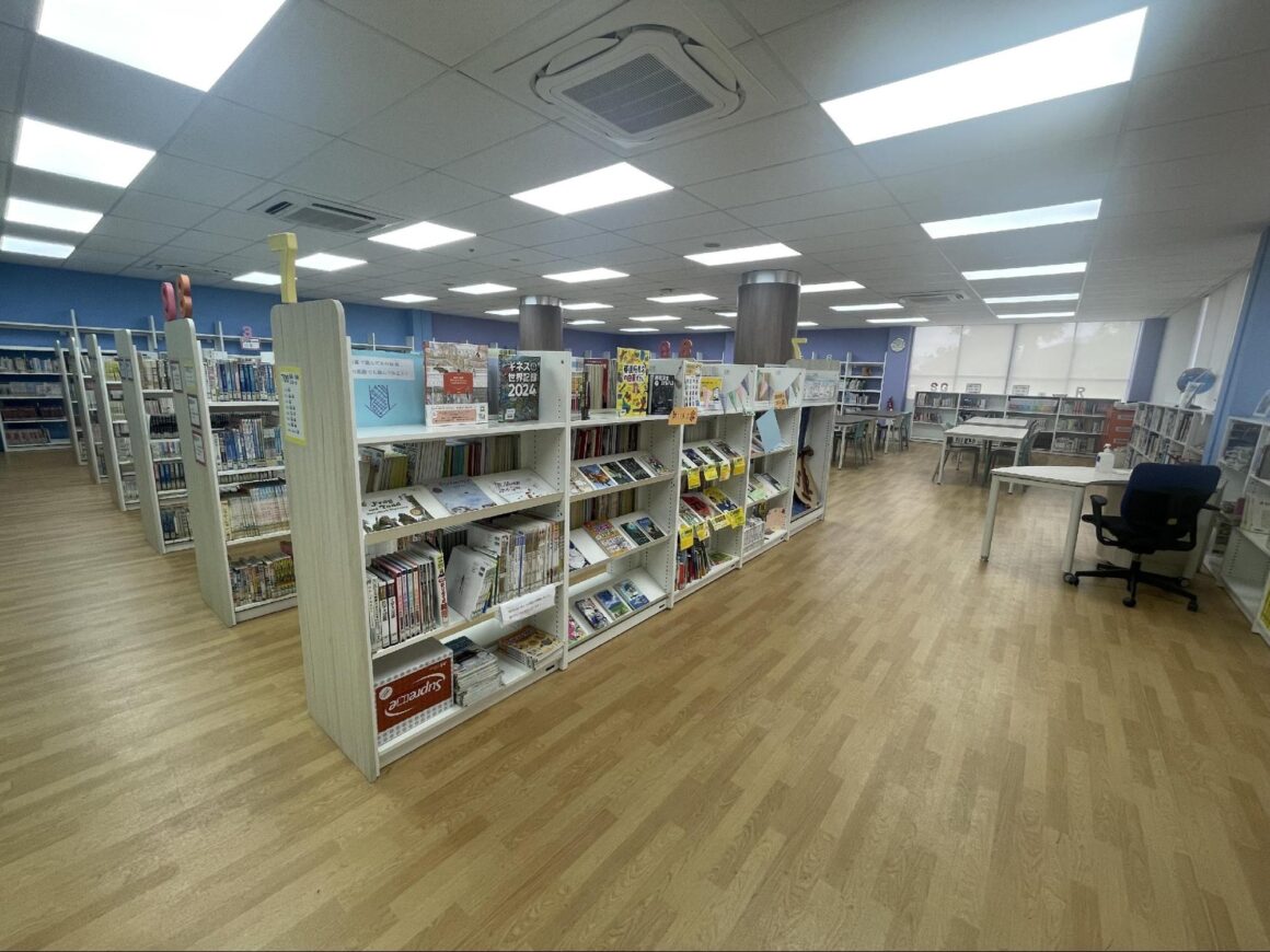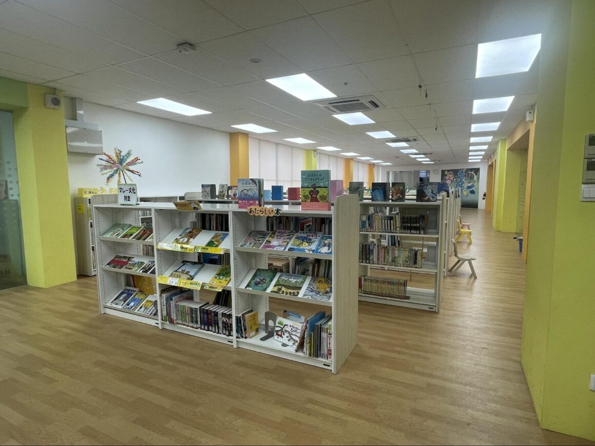 約2万2千冊の蔵書があり、英語・日本語と幅広く揃えています。読書スペースではグループ学習もできるようになっています。